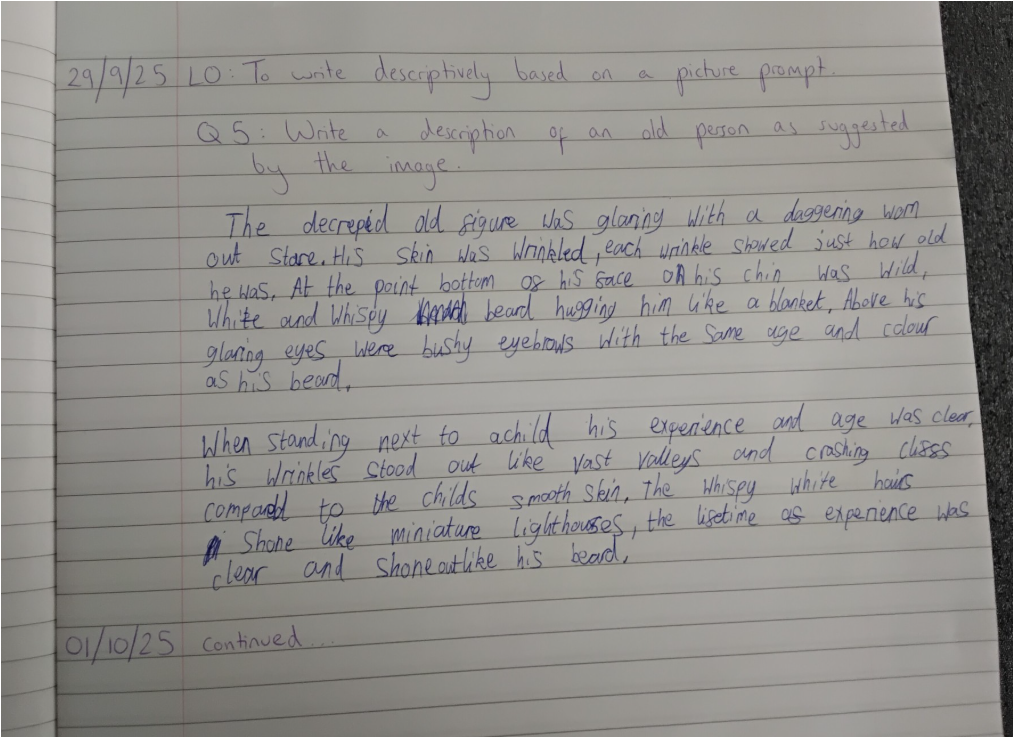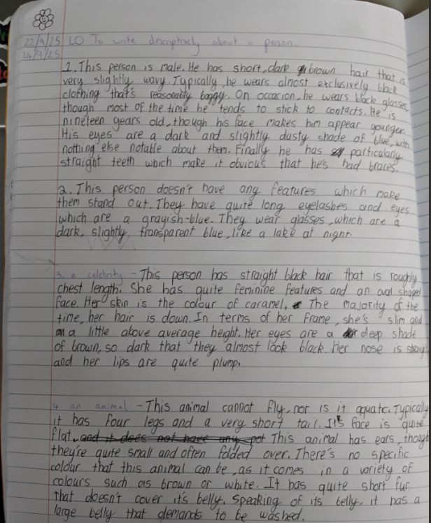 Lighthouse and Steeple have been completing descriptive writing work this term. This week they were learning how to effectively describe people and other living things in preparation for exam style questions. They have produced pages and pages of lovely writing and focused really well on the task. Well done!